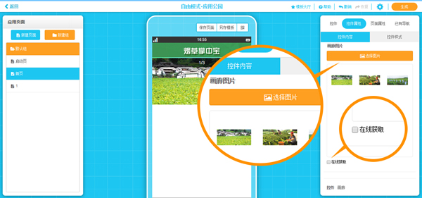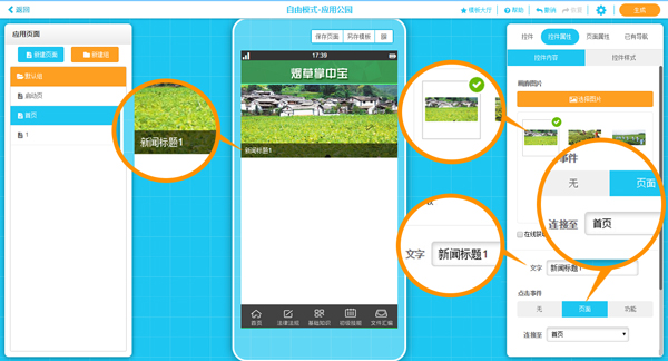 首先確保在畫廊二或者畫廊三的狀態下,在“控件屬性”——“控件內容”中點擊需要鏈接的單張圖片,然后在下方添加文字內容,最終在“頁面”選項中,選擇需要鏈接的頁面。這樣當用戶點擊這張圖片后,就可以跳轉到您設置好的頁面中了。