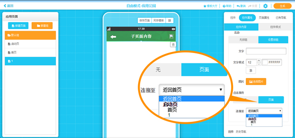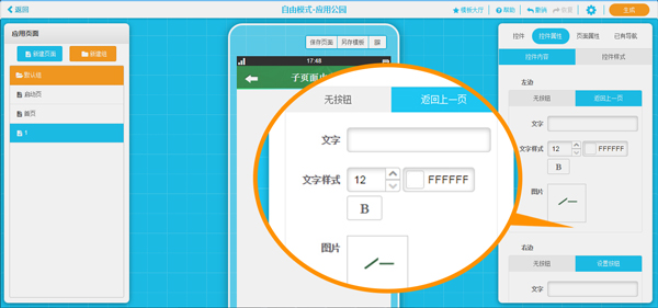 3.控件屬性中的控件內容:用于選擇導航的左側和右側是否顯示按鈕。選擇“無按鈕”則該側為空;如需按鈕則點擊“設置按鈕”,分別為它們進行名稱編輯和圖片設定,并選擇點擊按鈕后鏈接到的頁面。注:其中左側按鈕默認返回上一頁,右側按鈕可選返回首頁或鏈接到任意頁面,如果是需要返回首頁,一定要選擇“返回首頁”的選項。