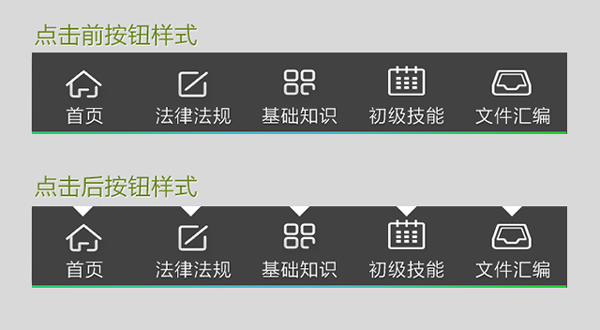 我們在手機中點擊按鈕,按下時都會有切換效果,這里也不例外哦,標簽導航允許分別設置【點擊前】和【點擊后】的效果。所以我們就按照步驟一計算好的尺寸(128×98像素),為每個標簽制作2張小圖,如下圖所示,點擊前的標簽按鈕圖片都是灰色,點擊后每個選項的上方都出現了一個白色的三角形,這樣在手機中里點擊時效果就比較明顯了。具體圖片制作方法這兒不說了,大家用photoshop簡單搞定(實在不會的同學可以去下載一些對比明顯的素材圖裁剪成對應尺寸也可以哦)。做好這10張小圖后將它們上傳到圖片庫里,然后在控件屬性欄中分別設置每個標簽的【圖片】和【按下圖片】。因為這里的標簽按鈕我們已經在圖片上做好文字了,所以要把“文字顯示”去掉。如果圖片上沒有文字,可以自己輸入。