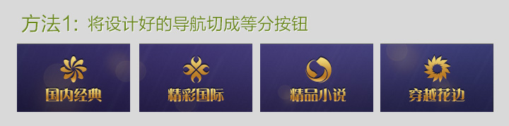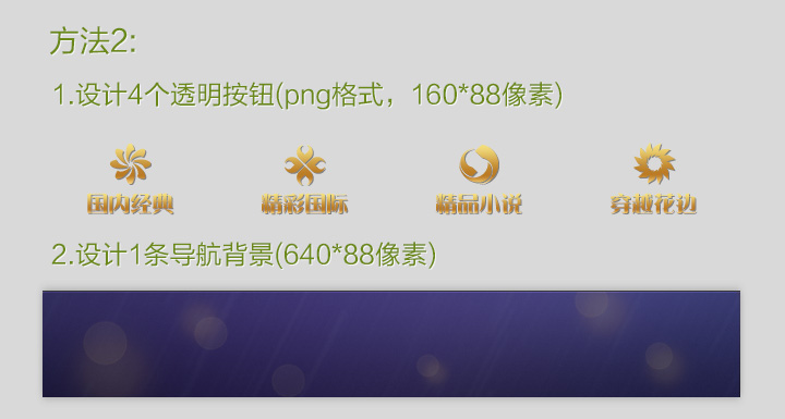 第一種方法:設計一個帶背景的640*88像素的導航條,然后將它切成160*88像素的4等份上傳。