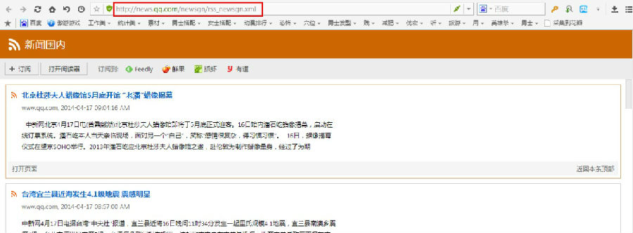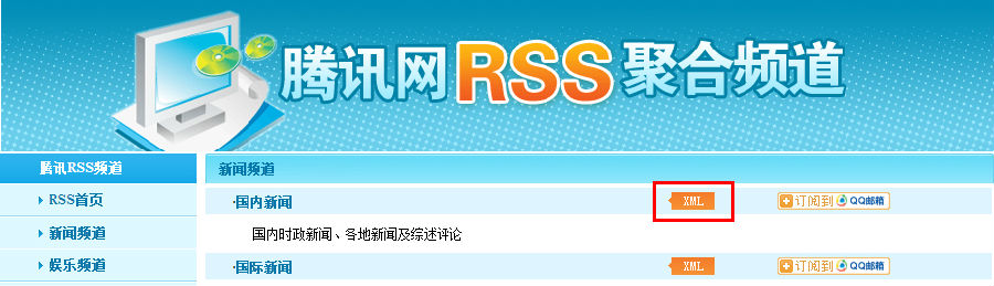 RSS(簡易信息聚合)可以幫助您訂閱一些新聞。使用時,首先要保證該新聞門戶提供rss功能支持。是否支持rss很好辨認,支持RSS的新聞門戶會有一個標志,您只需點擊這個圖標,即可進入提取網址頁面。進入后,點擊“XML”,進去地址頁,將地址復制進應用公園制作頁面的地址輸入欄內即可。*注意:部分RSS源并未對手機閱讀作相應優化,展現形式可能不適合手機瀏覽。目前僅支持后綴為.xml的鏈接。