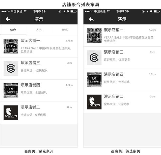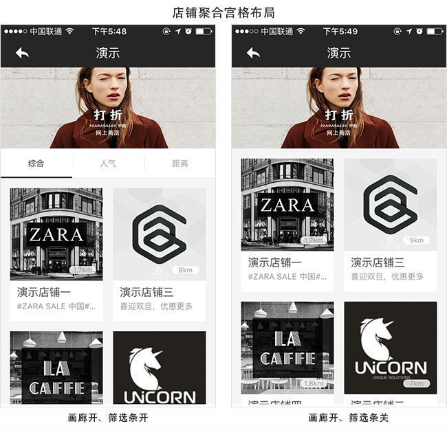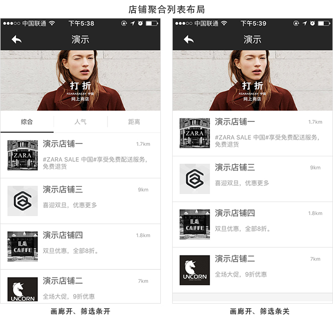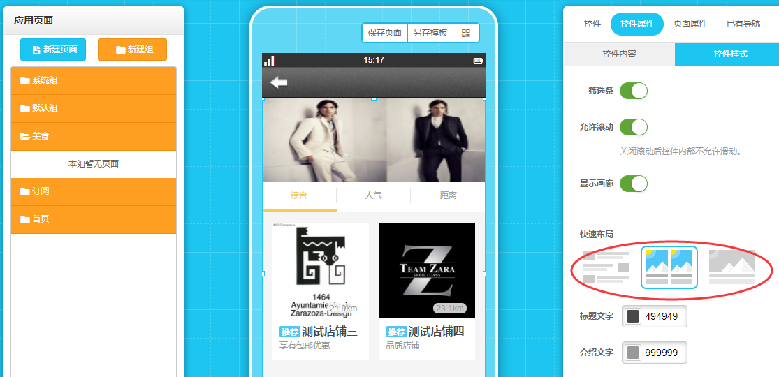 7. 運營管理平臺店鋪聚合添加完畢后,進入制作頁面設置店鋪聚合的展示樣式。在制作頁面的“控件屬性”——“控件內容”中,選擇好聚合源,然后在控件樣式中設置該頁面店鋪聚合及店鋪中商品的展示樣式即可。(分類導航中選中分類的顏色和個人中心保持一致,修改位置在制作頁面右上角的小齒輪“設置”中。店鋪的人氣是根據手機用戶瀏覽量決定,一部手機一天內僅計為1次瀏覽量。)