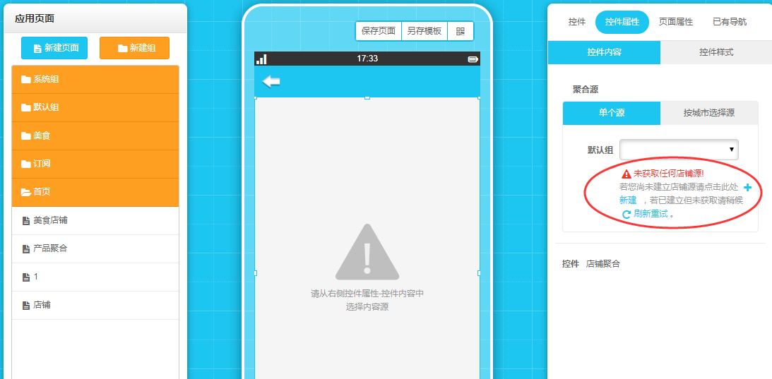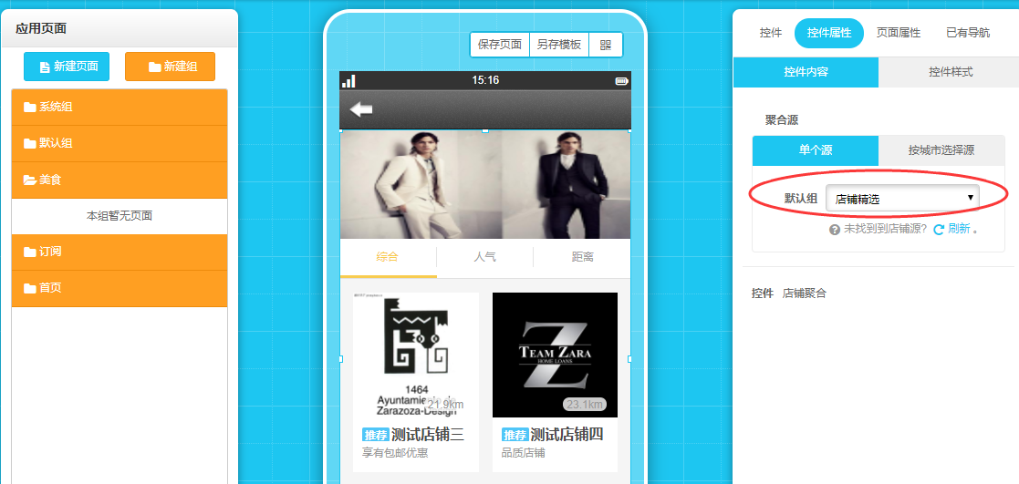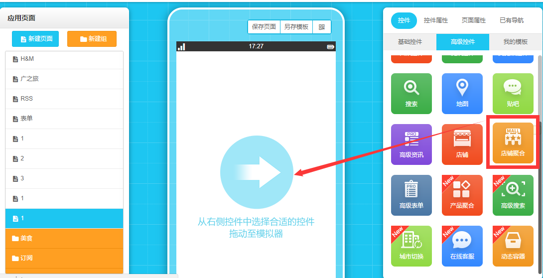 1.新建頁面,并在“高級控件”中選擇“店鋪聚合”控件,將其拖入模擬器中,該控件可以根據自身需要顯示效果,調整高度。