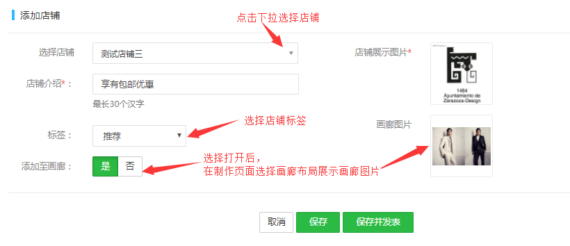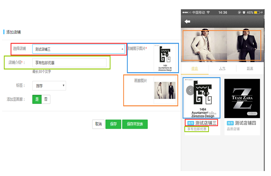*店鋪在添加后,如果點擊“保存”,那么該店鋪暫時不會顯示在手機客戶端中, 需要之后另外改上架狀態。如果點擊“保存并發表”,店鋪就會直接被發布在手機客戶端中。