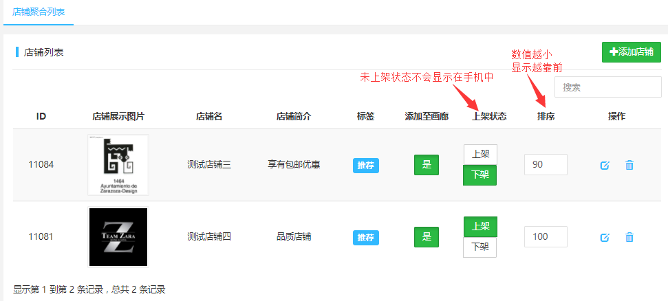 6.填寫好后,在店鋪聚合管理頁面就可以看到您編輯完成的店鋪列表了,其中如果店鋪上架狀態為“未上架”表示暫不發布。待到發布前將發布狀態勾選為“已上架”即可。按照剛才的方式,添加多個店鋪,并調整店鋪顯示的排序。(添加了畫廊的店鋪,在運營管理平臺默認顯示在最上方。)