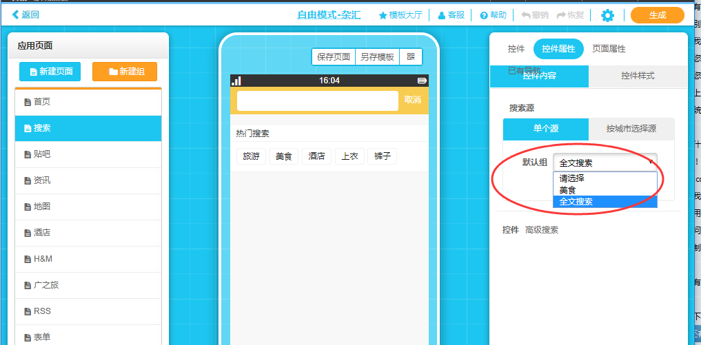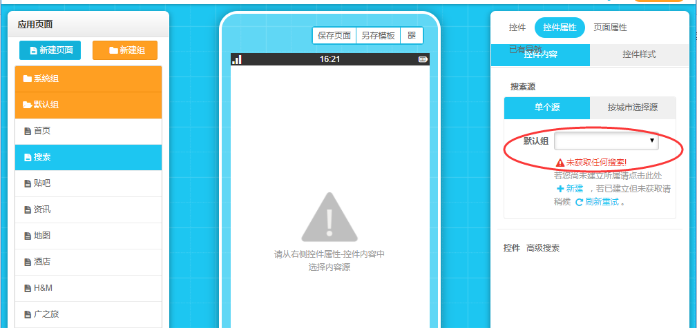1.新建頁面,將高級搜索控件拖入模擬器中。(高級搜索控件頁面不支持添加其他任何控件,并且頂部歷史導航顏色來自于制作頁面右上角設置中的應用風格。)然后在“控件屬性”——“控件內容”中選擇搜索源即可。沒有搜索源的需要在運營管理平臺新建搜索源。