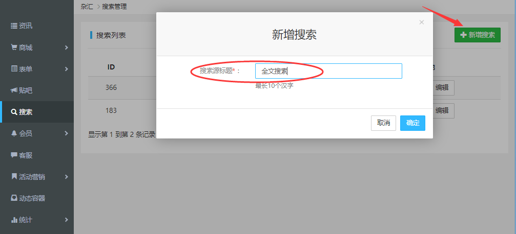 2.在運營管理平臺點擊高級搜索模塊,然后點擊“新增搜索”。輸入搜索源名稱,點擊確定。