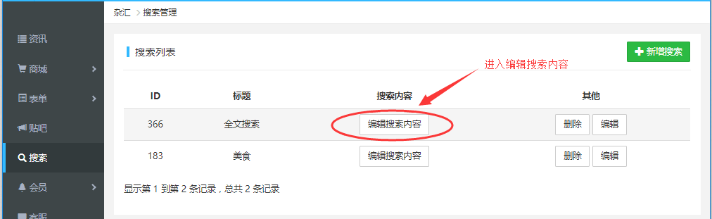 3.搜索源創建后,最右側的“編輯”是用來修改搜索源名稱,點擊中間的“編輯搜索內容”,進行內容編輯。