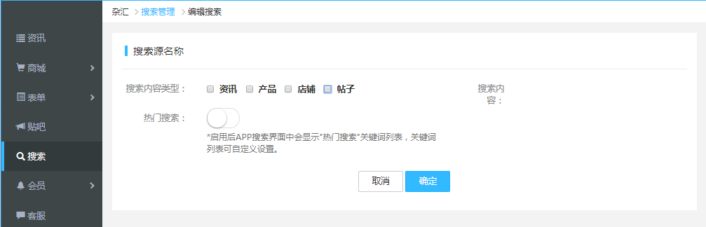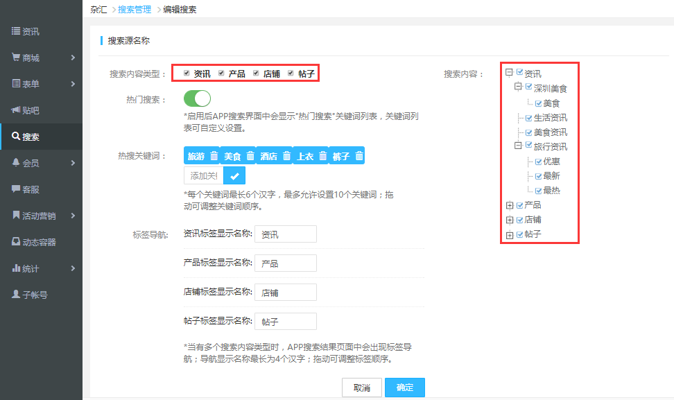 4.在搜索源的內容編輯頁面,需要勾選在這個搜索源中支持搜索的內容類型,如果不勾選某種類型,那么搜索結果中就不會出現該類型中的內容。熱門搜索熱門搜索詞匯,現在在搜索框下方,是制作者自定義開啟的,開啟后可以編輯一些快捷顯在搜示索頁面,方便用戶使用。