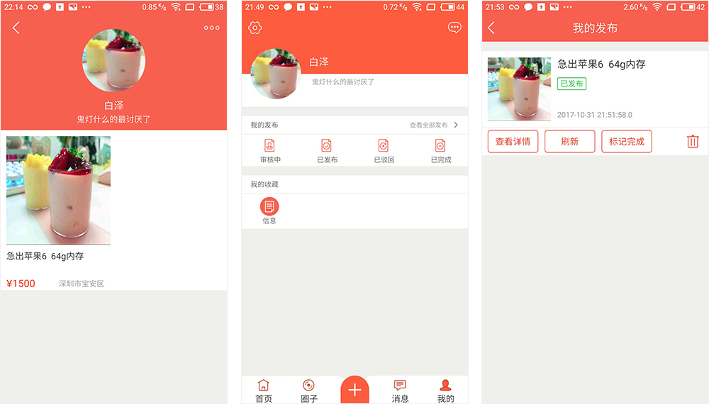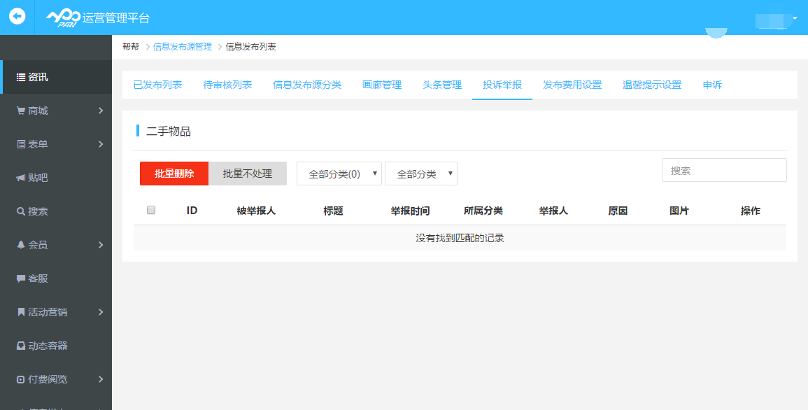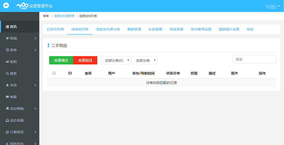 9.目前“二手物品”這個信息發布源已經可以使用了,用戶發布的信息會先提交在運營管理平臺的“待審核列表”中,管理者可以根據實際情況進行審核,通過后用戶的信息就會展示在App中,被駁回的可以查看駁回原因進行修改,再進行二次提交。因為投訴而被下架的內容,也會收到下架通知,有30個自然日的申訴期,在此期間,可以為自己申訴,申訴的申請同樣會提交到運營管理平臺,通過申訴的,會在此顯示在App中,30個自然日內仍未通過的,將會被永久刪除。