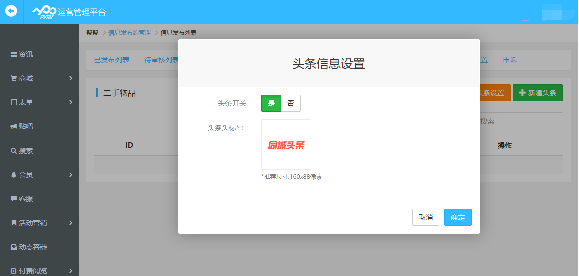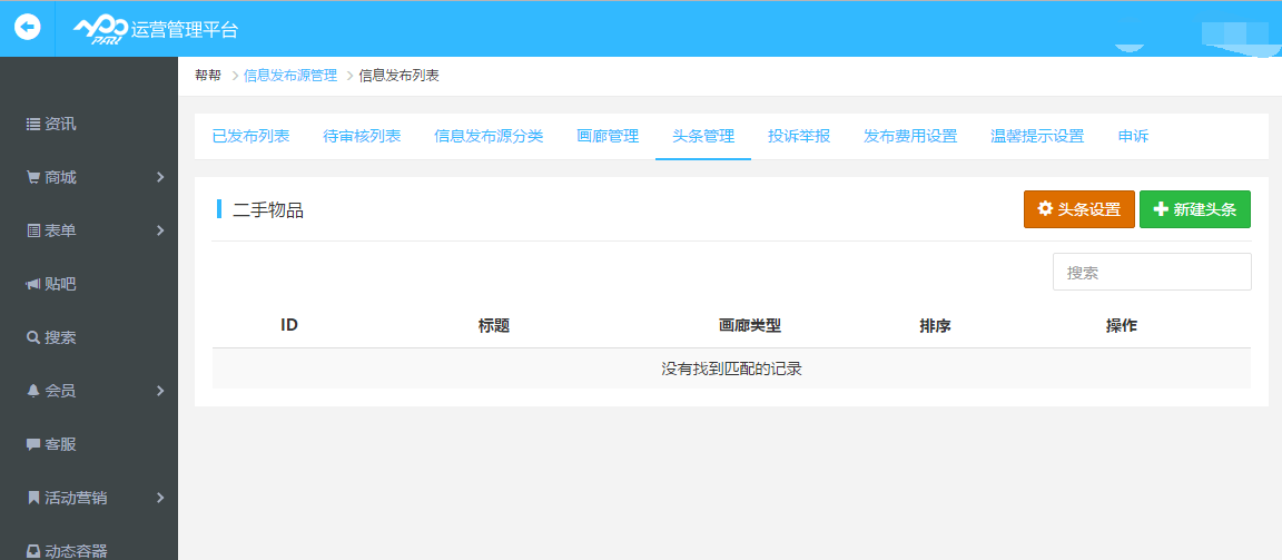 12.設置好畫廊后,可以開啟畫廊下方的“頭條”,在運營管理平臺點擊“頭條管理”,進行“頭條設置”。
