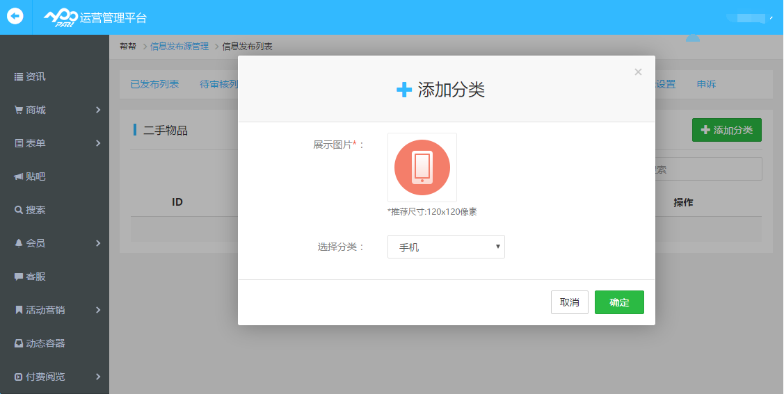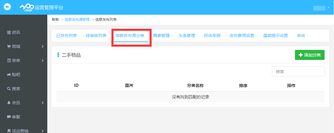4.設置好費用后,點擊“信息發布源分類”——“添加分類”創建顯示在App端的二手物品里面的分類。