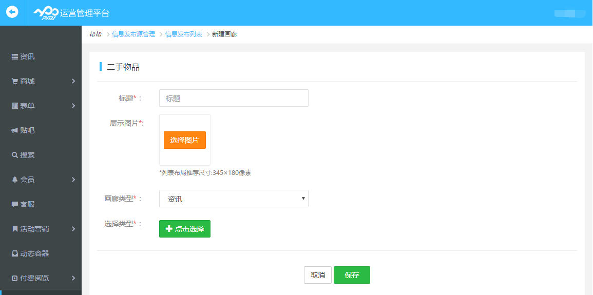 11.為了美觀,我們可以對二手物品頁面的樣式進行設置。點擊“畫廊管理”——“畫廊設置”,選擇是否開啟畫廊,叫畫廊中是否顯示文字標題,設置好后,點擊“新建畫廊”,在新的頁面中添加畫廊的標題及畫廊圖片,然后選擇畫廊鏈接的類型,目前支持“資訊、產品、高級表單、信息發布”,勾選好類型后,選擇該類型下的某條信息內容即可。每個信息發布源(如“二手物品”)最多可以建立6個畫廊內容,為了美觀,建議創建的條數為雙數。