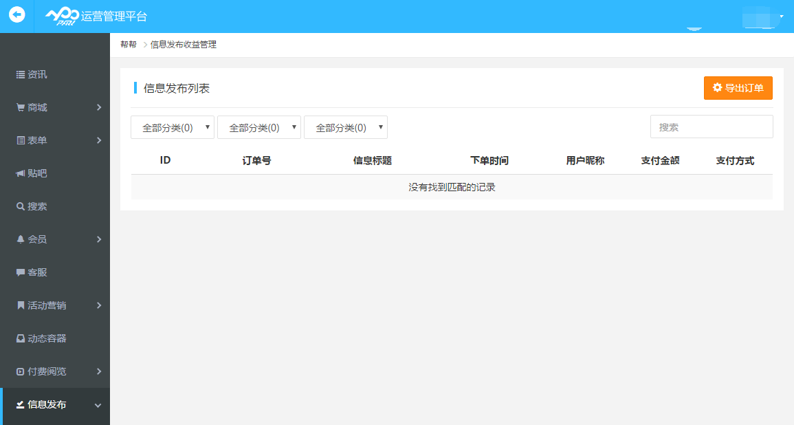 10.如果信息發布源開啟了付費發布/刷新,那么已經付款成功的訂單,會出現在“收益管理”中,以供查詢,訂單同時支持導出。