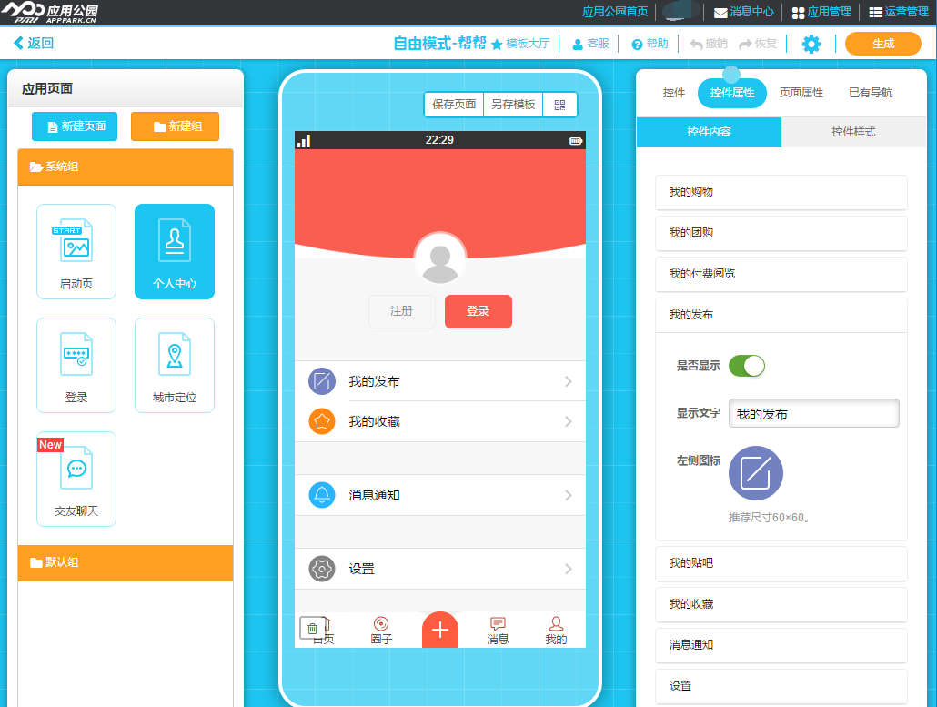 6.設置好分類后,打開制作頁面,先在“系統組”的“個人中心”頁面,將“我的發布”打開。
