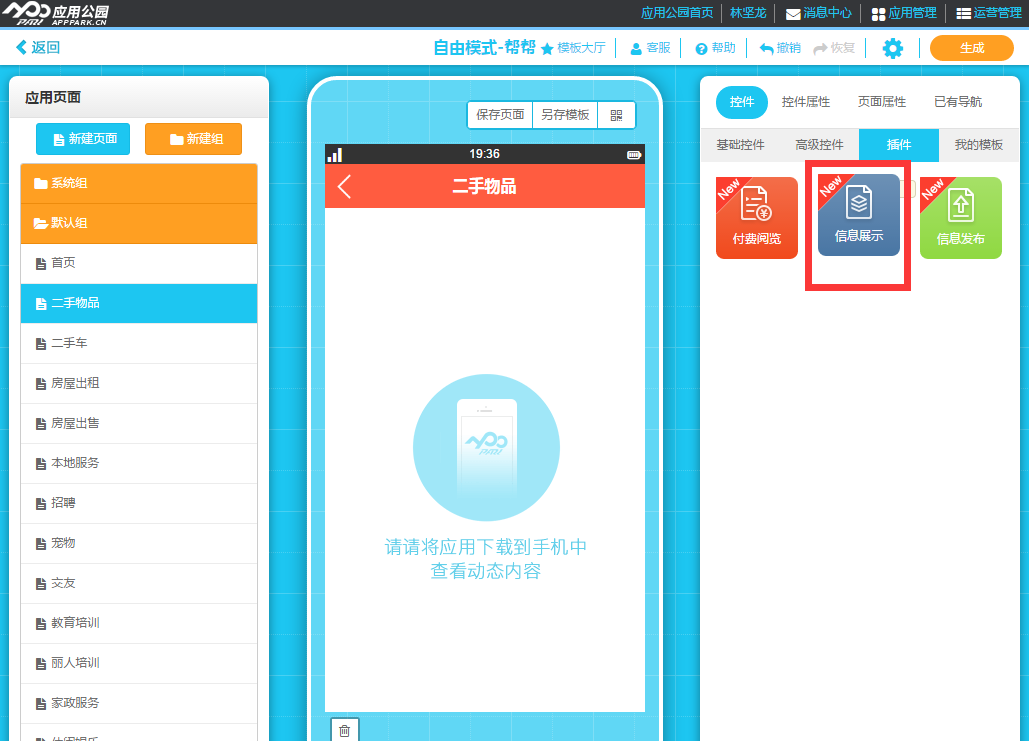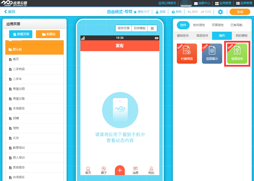 8.有了信息展示的地方,還需要添加一個用戶的發布入口,用戶通過這個頁面可以發布信息到App中。同樣新建一個頁面,在插件中拖入“信息發布”插件即可,信息發布插件會默認顯示您已經添加在運營管理平臺中的信息發布源。