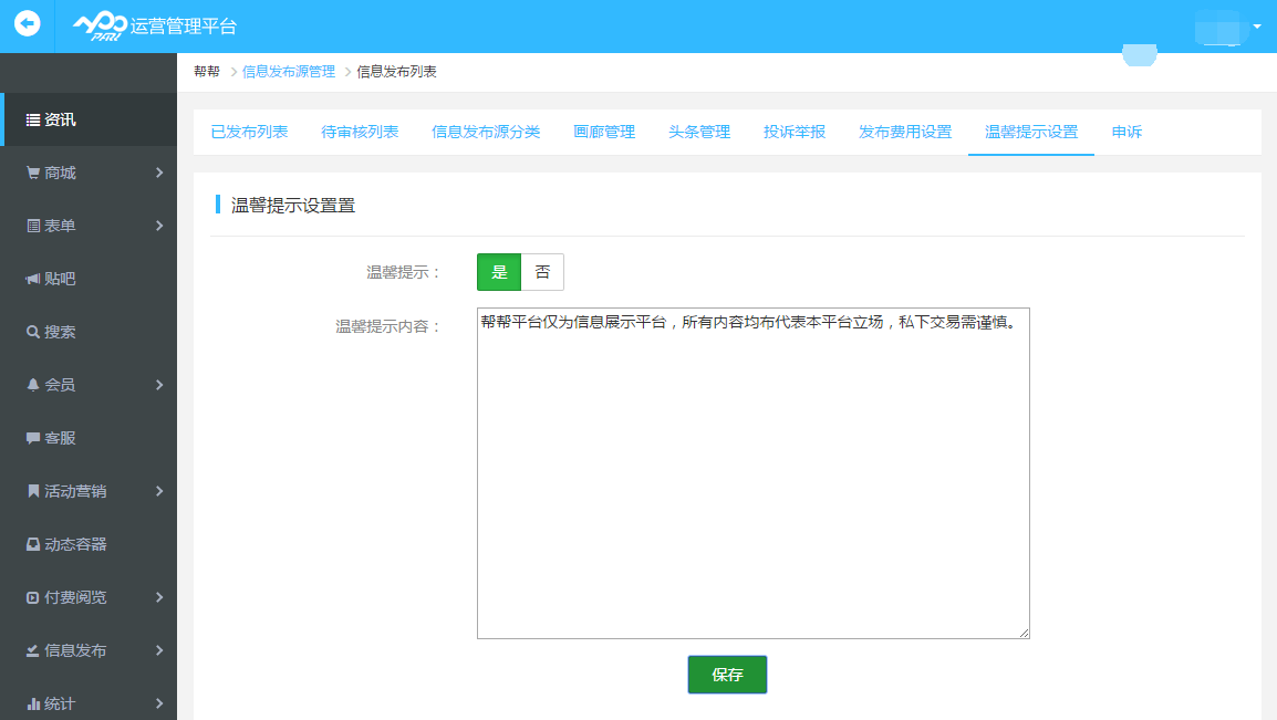 14.溫馨提示設置,該設置開啟并編寫后,會顯示在用戶發布的信息詳情頁,用以提示用戶交易需謹慎等功能。