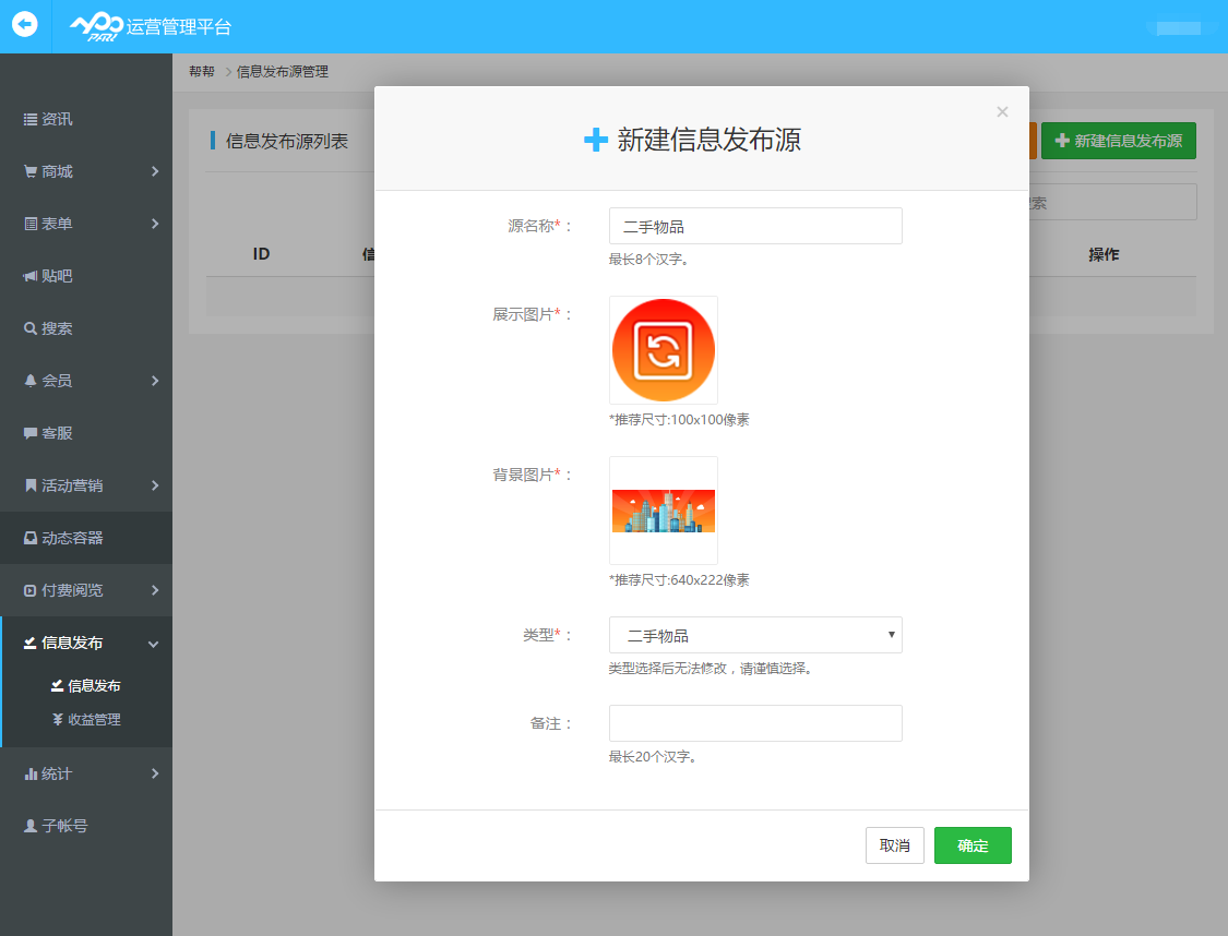 2.支付設置好后,點擊“新建信息發布源”,按照要求填寫內容即可。