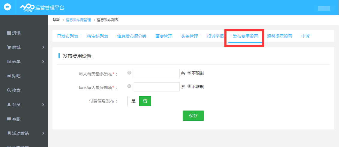 3.創建好后,選擇“發布費用設置”,對用戶發布信息的收費情況進行設置。
