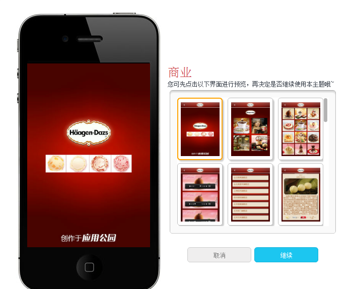 主題模式是應(yīng)用公園的中級(jí)模式,靈活豐富,適用性強(qiáng),可以滿足大多數(shù)手機(jī)App的制作需求。現(xiàn)有商業(yè)、娛樂、旅游、健康、美食等十余款主題模板,熱門模板還將陸續(xù)開放。