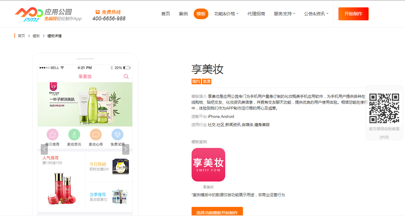 推薦使用應用公園在線開發app平臺。應用公園有十多年開發經驗,已經為眾多企業和個人在線生成了130多萬款app,里面的app模板涉及各行各業,還有海量app功能控件,只需拖拽移動,上傳自己的文字信息和圖片,一鍵生成美妝app。下圖為美妝類app模板-享美妝,是應用公園專門為手機用戶量身訂制的美妝類手機應用軟件,具有各種在線購物、貼吧交友、化妝資訊類信息,并擁有交友聊天功能,歡迎您來體驗。