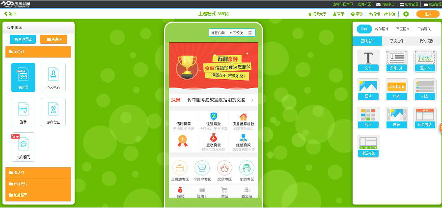 第三步,對模板的圖片文字進(jìn)行替換。應(yīng)用公園的操作原理就是將常見的APP功能開發(fā)出來后,放置在平臺(tái)上,不懂技術(shù)人就可以根據(jù)平臺(tái)的功能進(jìn)行自由搭配。而且平臺(tái)上有很多類似萬利金融的模板,可以一鍵套用,進(jìn)隊(duì)圖片文字進(jìn)行替換即可。目前新聞資訊、交友聊天、同城服務(wù)、電商、論壇、貼吧等都可以自由組合。