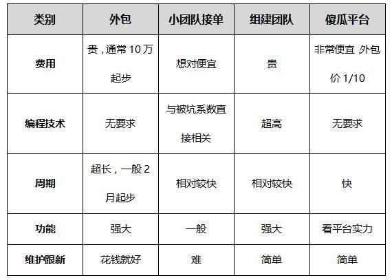 外包開發:周期長、費用貴、但是功能完善,小團隊接單便宜,但是漏洞較多,后期可能找不到人。組建團隊對技術實力要求高。