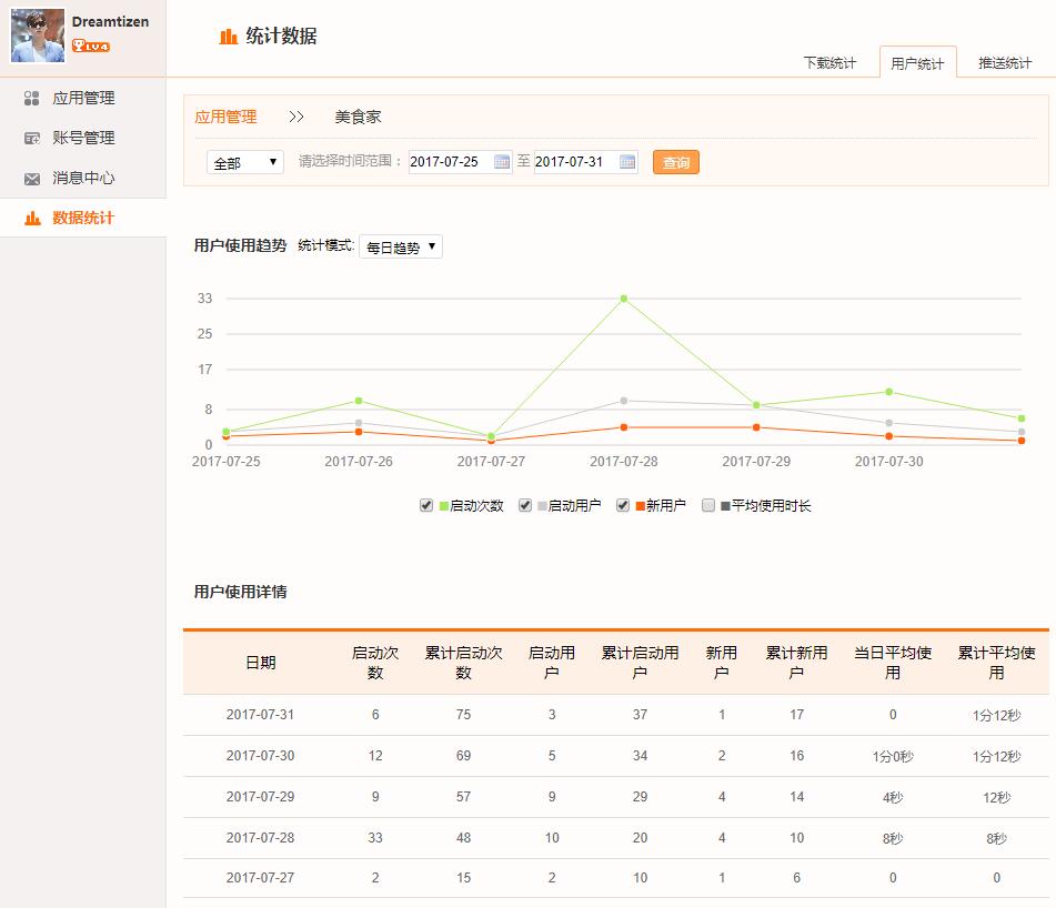 應用統計:安裝用戶、活躍用戶、注冊會員、啟動次數、累計用戶等關鍵數據清晰明了,支持數據導出。