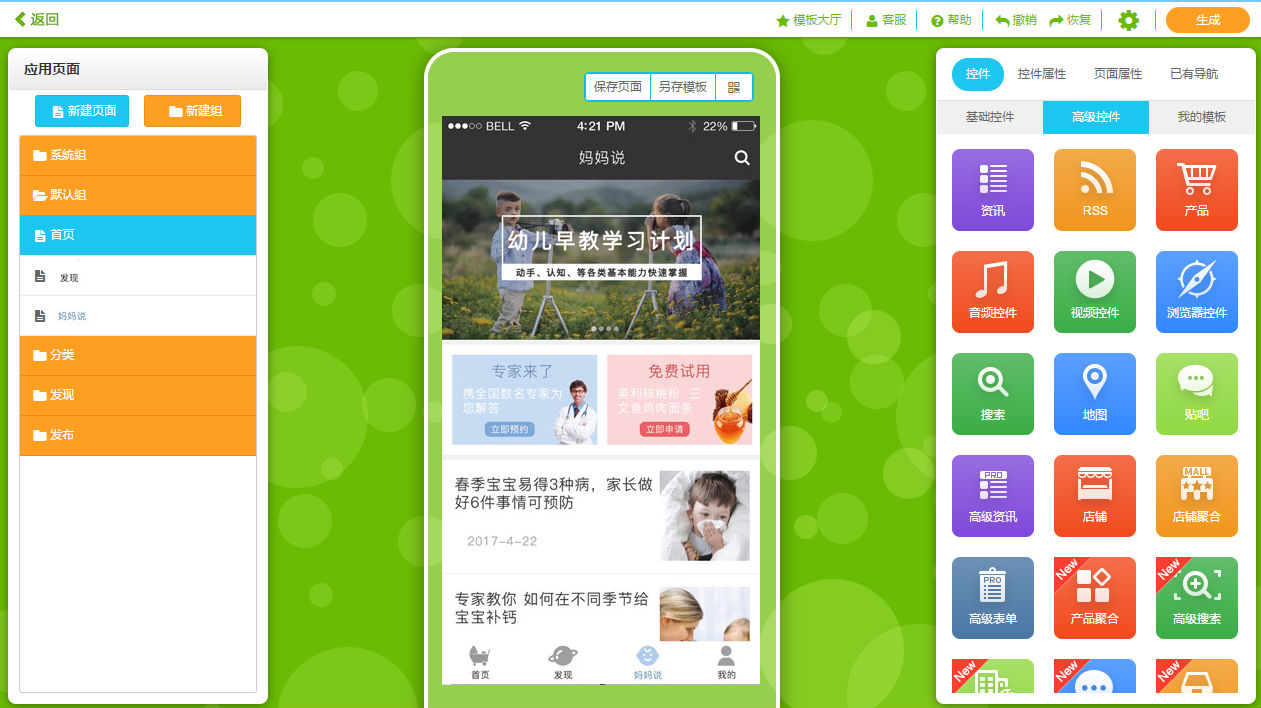 具體的功能,大家可以到應用公園官網進行下載或者制作體驗。而且應用公園平臺還累計了上百個常見的APP功能,比如地圖、定位、新聞資訊、聊天等等,不需要編程,就可以對母嬰APP模板進行修改,也可以自己從零搭建一個的母嬰育兒類APP。