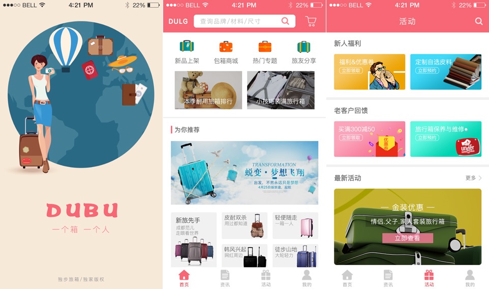 以“獨步旅行箱”這款箱包APP為例,可實現的功能包括: