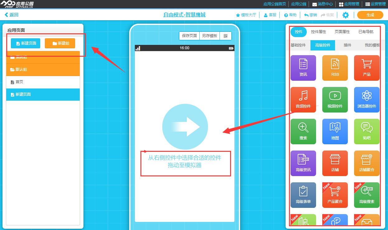 如果是自由模式,進(jìn)入平臺就是一個空白的APP,可以在左側(cè)添加頁面,把右側(cè)的功能控件拖入中間的模擬器中進(jìn)行使用。所有功能自由選擇添加。