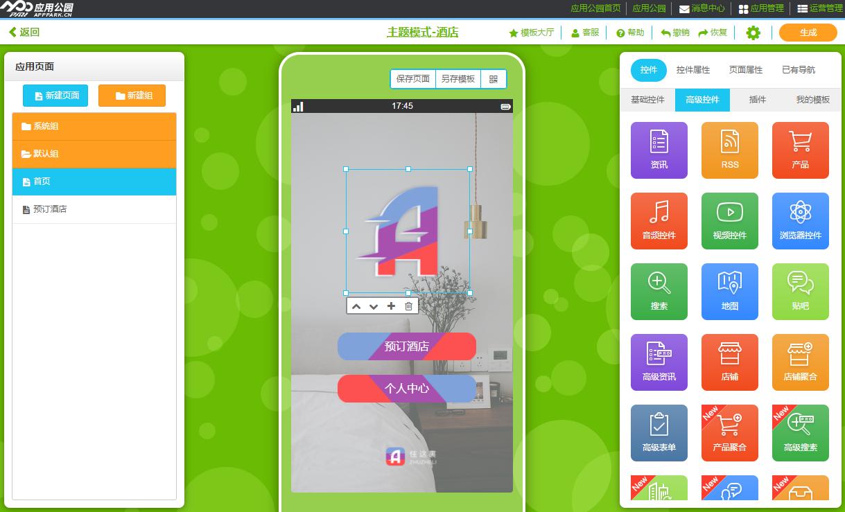 如果對(duì)這款酒店APP模板仍不能滿足你的個(gè)性化需求,應(yīng)用公園平臺(tái)還包含上百個(gè)常見的手機(jī)APP功能控件,可以對(duì)模板上的功能進(jìn)行自由添加修改。而且,自己也可以從零開始,創(chuàng)建一個(gè)的手機(jī)APP。全部過程都是免編程、拼圖式、拖拽式操作。