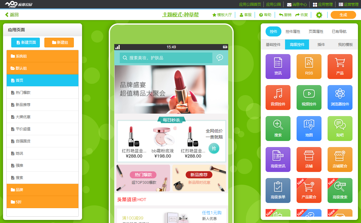 利用應用公園制作APP的核心模式就是:應用公園平臺擁有上百種常見的APP功能控件,我們不需要編程,只需把需要的功能挑選出來,進行拼圖式排版,就能快速制作一個電商類APP。